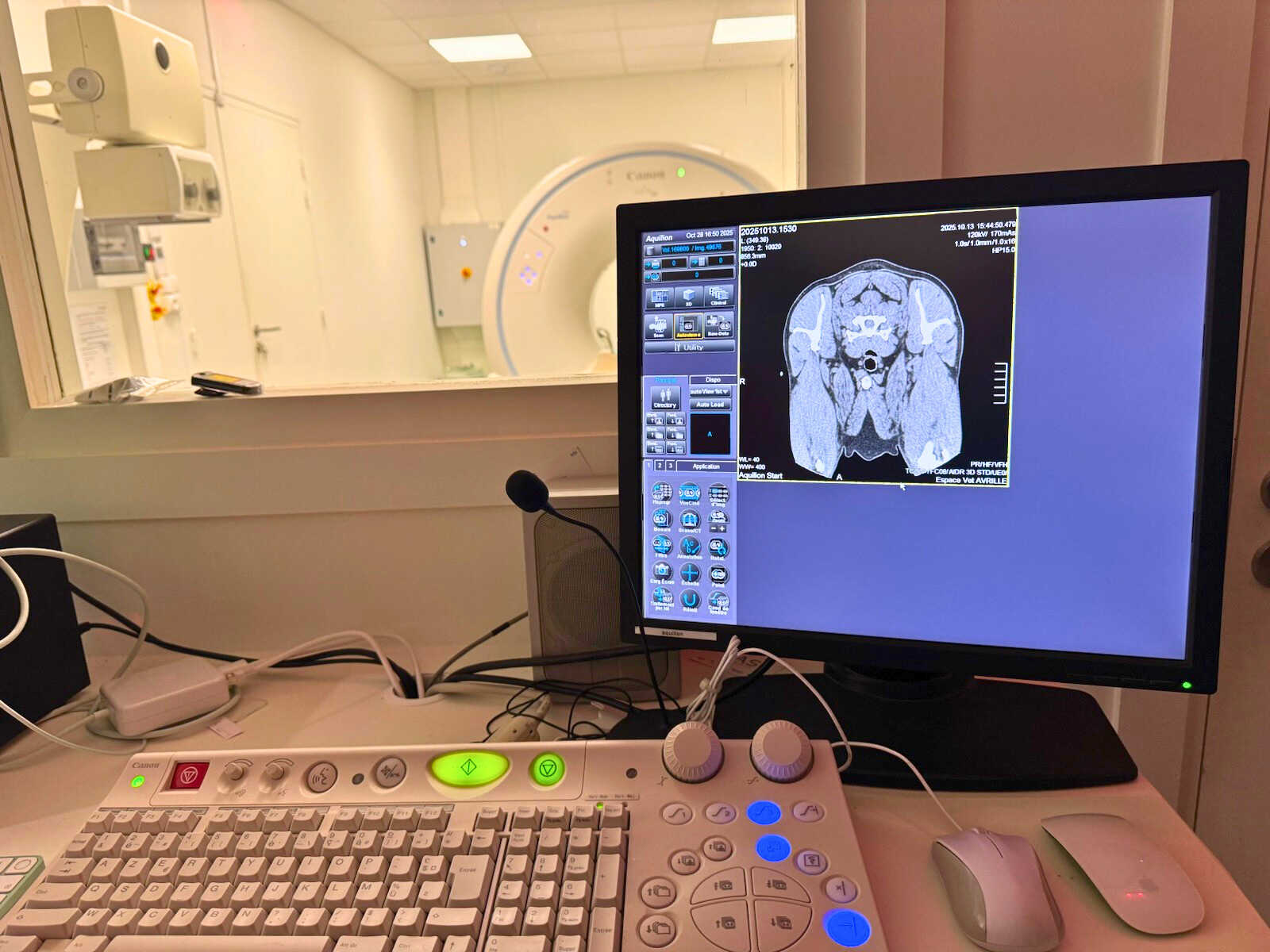 Nous disposons également d’un équipement de tomodensitométrie (scanner), qui nous permet d’obtenir des images en coupe très précises des structures internes de vos compagnons (os, articulations, cerveau, cavités thoraciques/abdominales…).